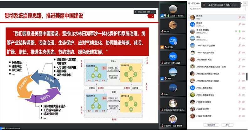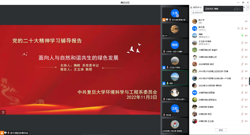 为深入学习贯彻党的二十大精神,将理论宣讲和专业特点相结合,2022年11月3日,环境科学与工程系党委组织全体党员参加二十大精神学习辅导报告。系党委书记梅鲜同志主持,环境科学与工程系王玉涛教授主讲。环境科学与工程系和大气与海洋科学系400多名师生党员参加学习。